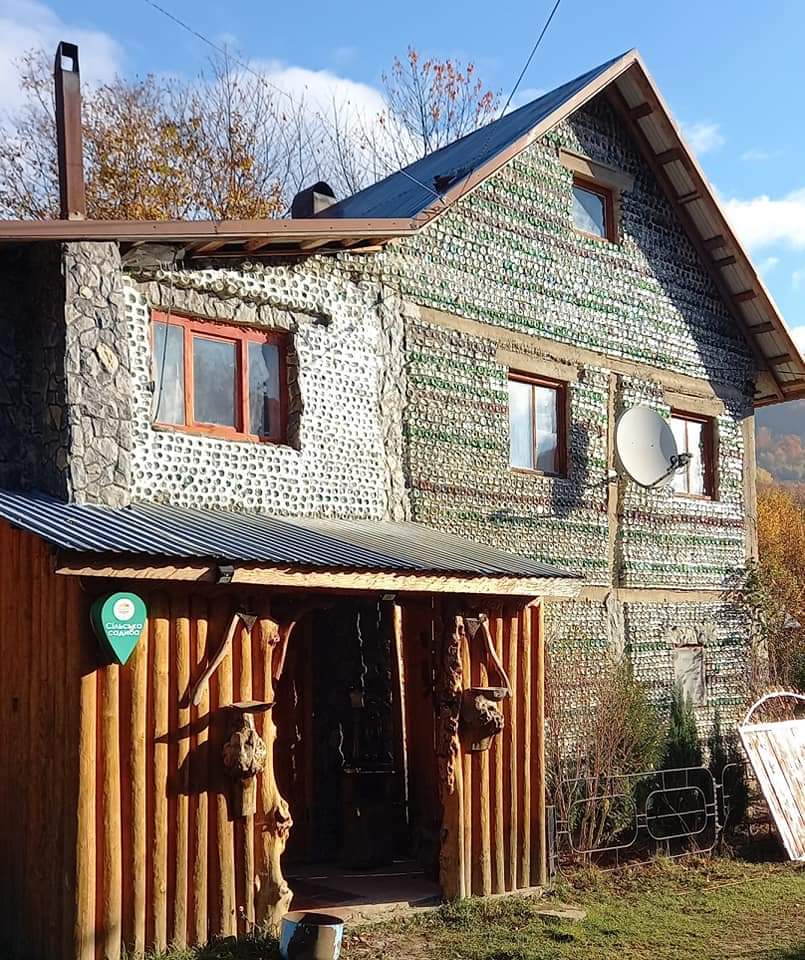 На території садиби розташований затишний двоповерховий котедж, побудований за унікальною технологію. Він зроблений з пляшок, замість цегли. Котедж може розмістити до 8 гостей.